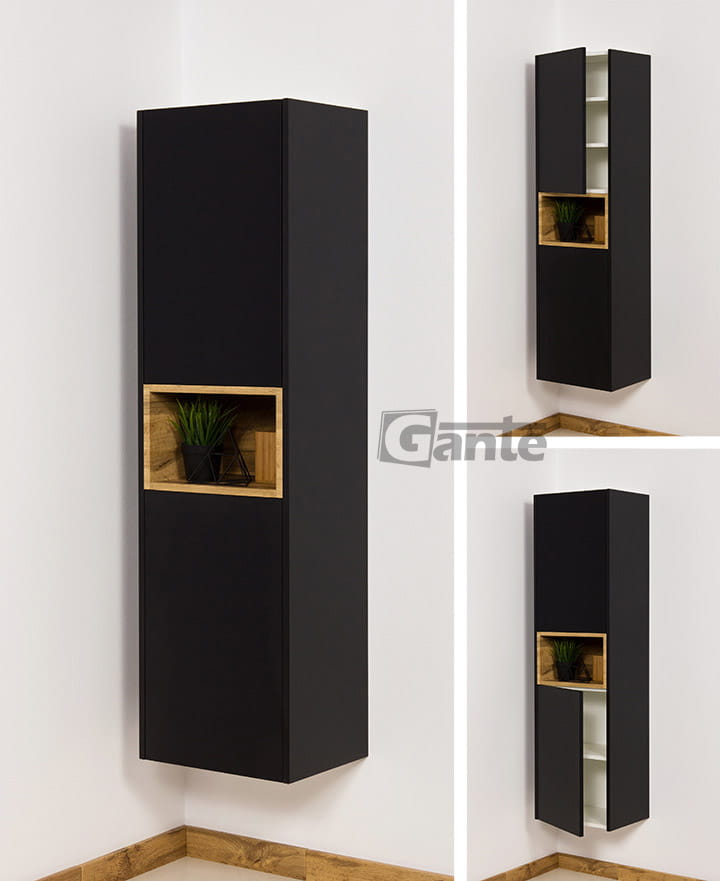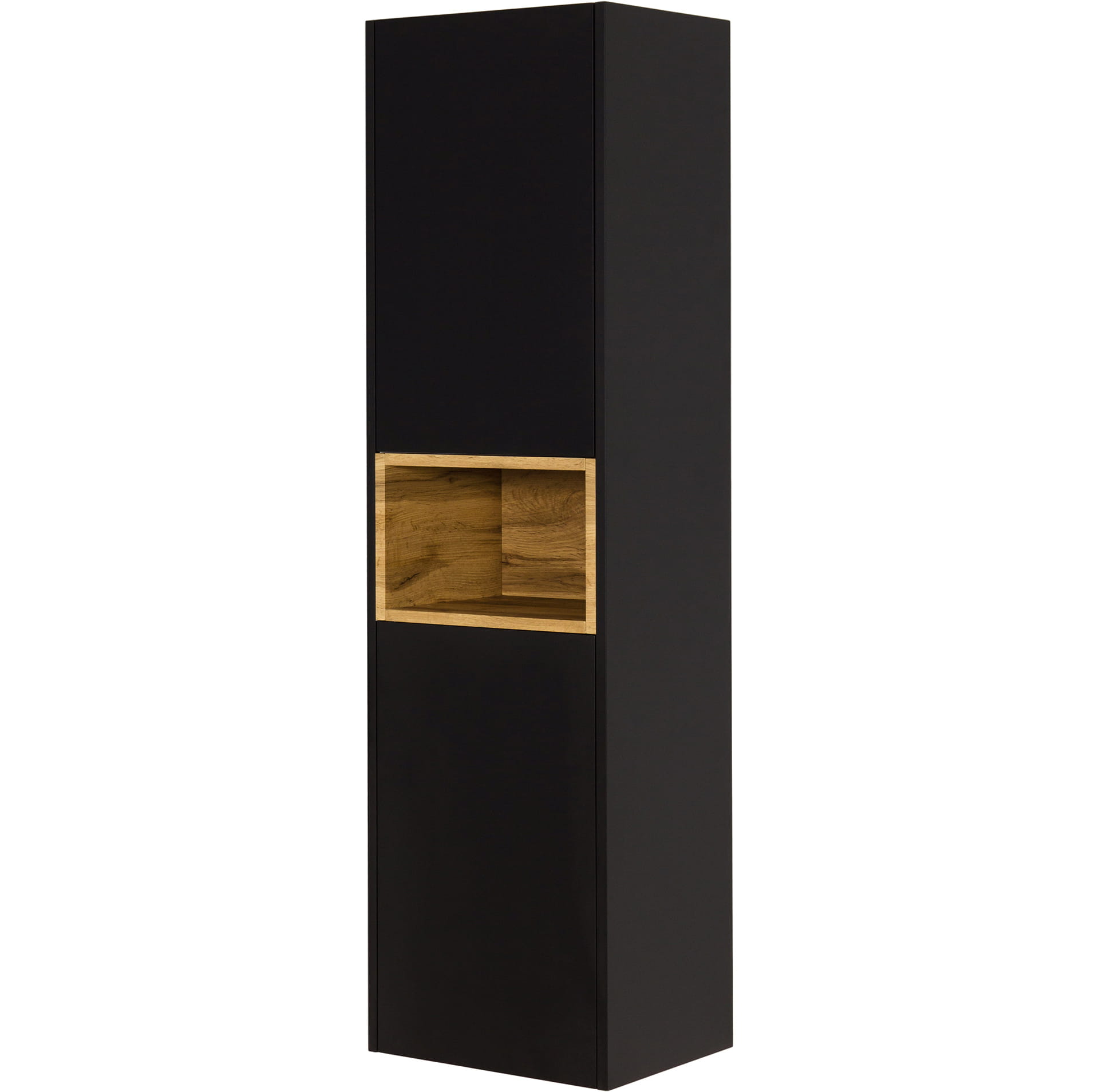 Nowoczesny, bardzo ekskluzywny regał łazienkowy z serii Space w czarnym, matowym kolorze ze wstawką w kolorze naturalnego drewna.