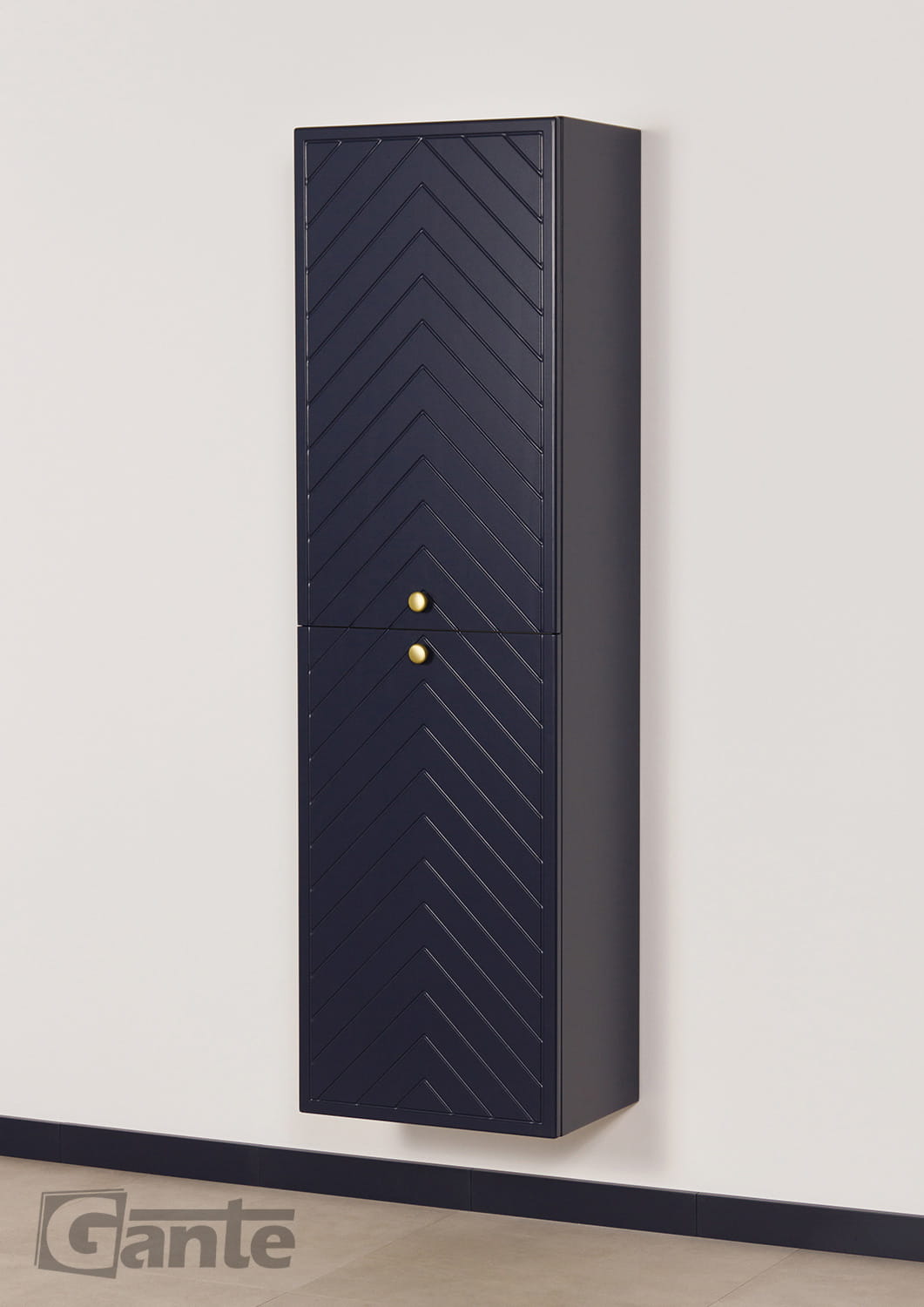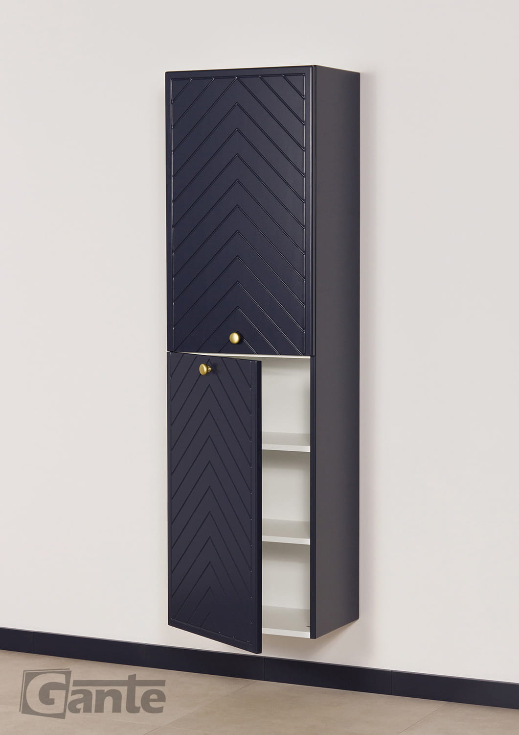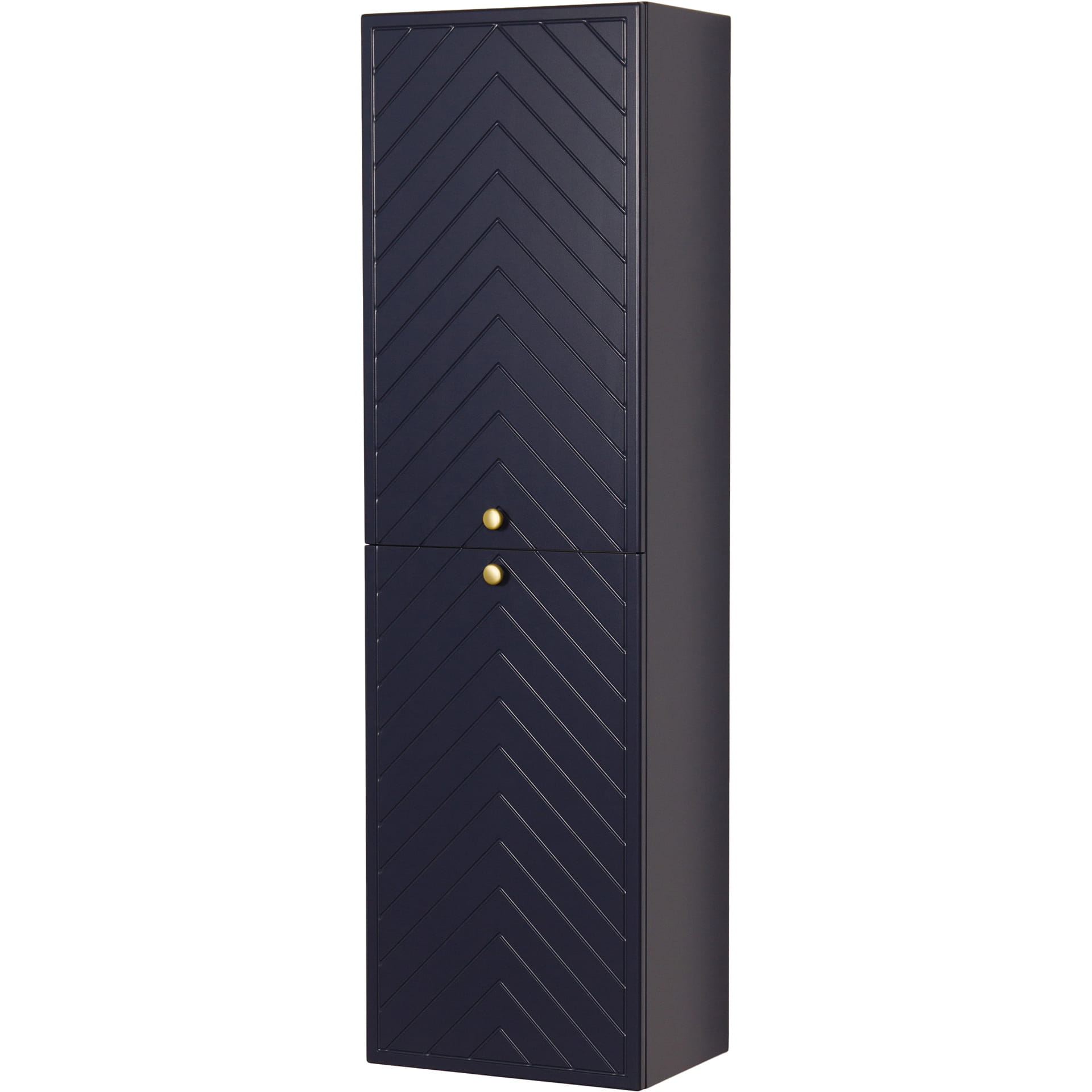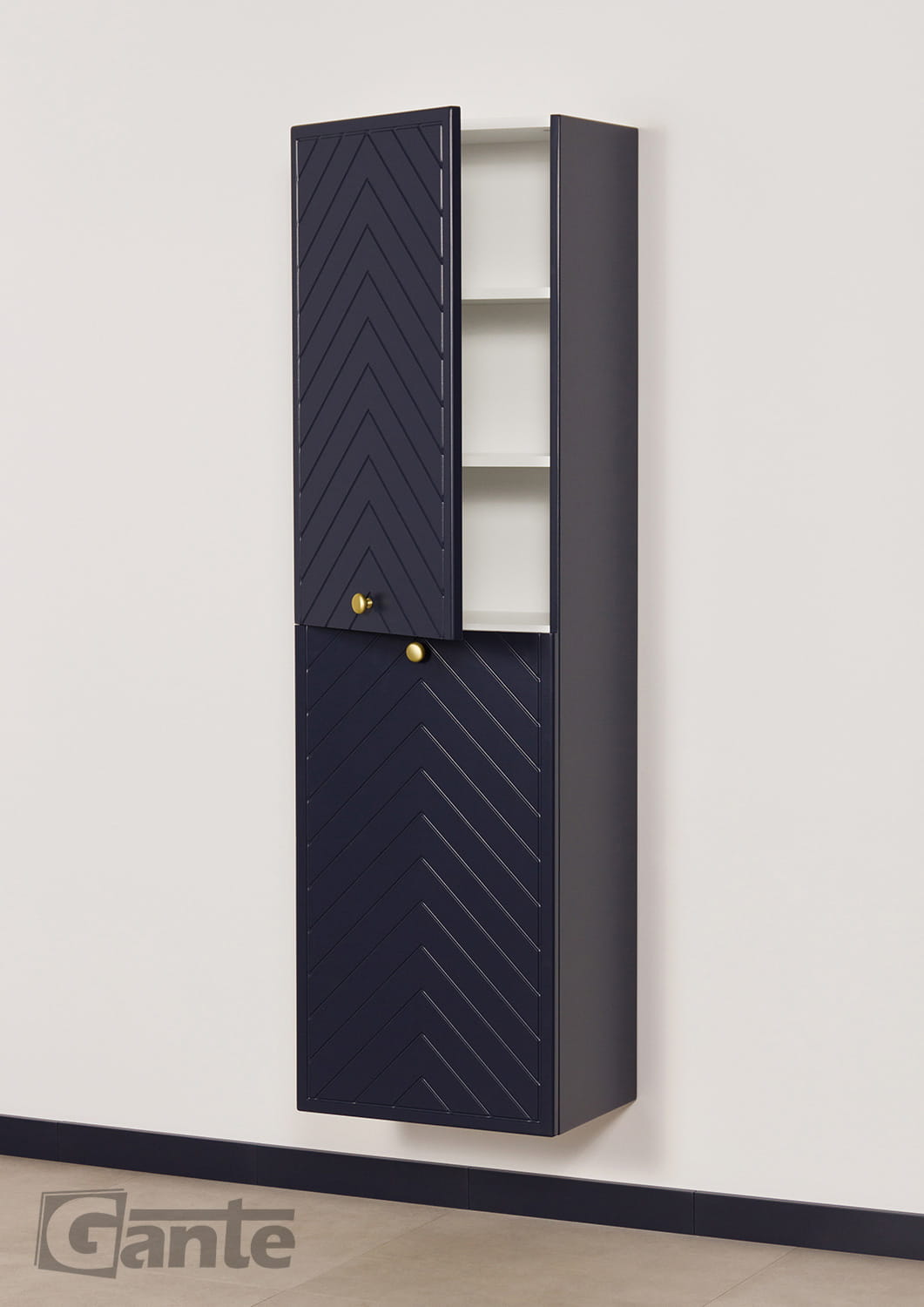 Regał łazienkowy wiszący z kolekcji Kodi w granatowym, matowym kolorze. Fronty regału zostały ozdobione frezami we wzór jodełki. Słupek posiada dwoje drzwiczek, za którymi znajdziemy w sumie 6 półek o regulowanej wysokości. Do otwierania regału służą eleganckie uchwyty w postaci złotych gałek meblowych. Drzwi regału wyposażone są w zawiasy z systemem cichego domykania, który sprawia, że drzwiczki w ostatniej fazie zamykania zwalniają, aby niemal bezgłośnie się zamknąć.