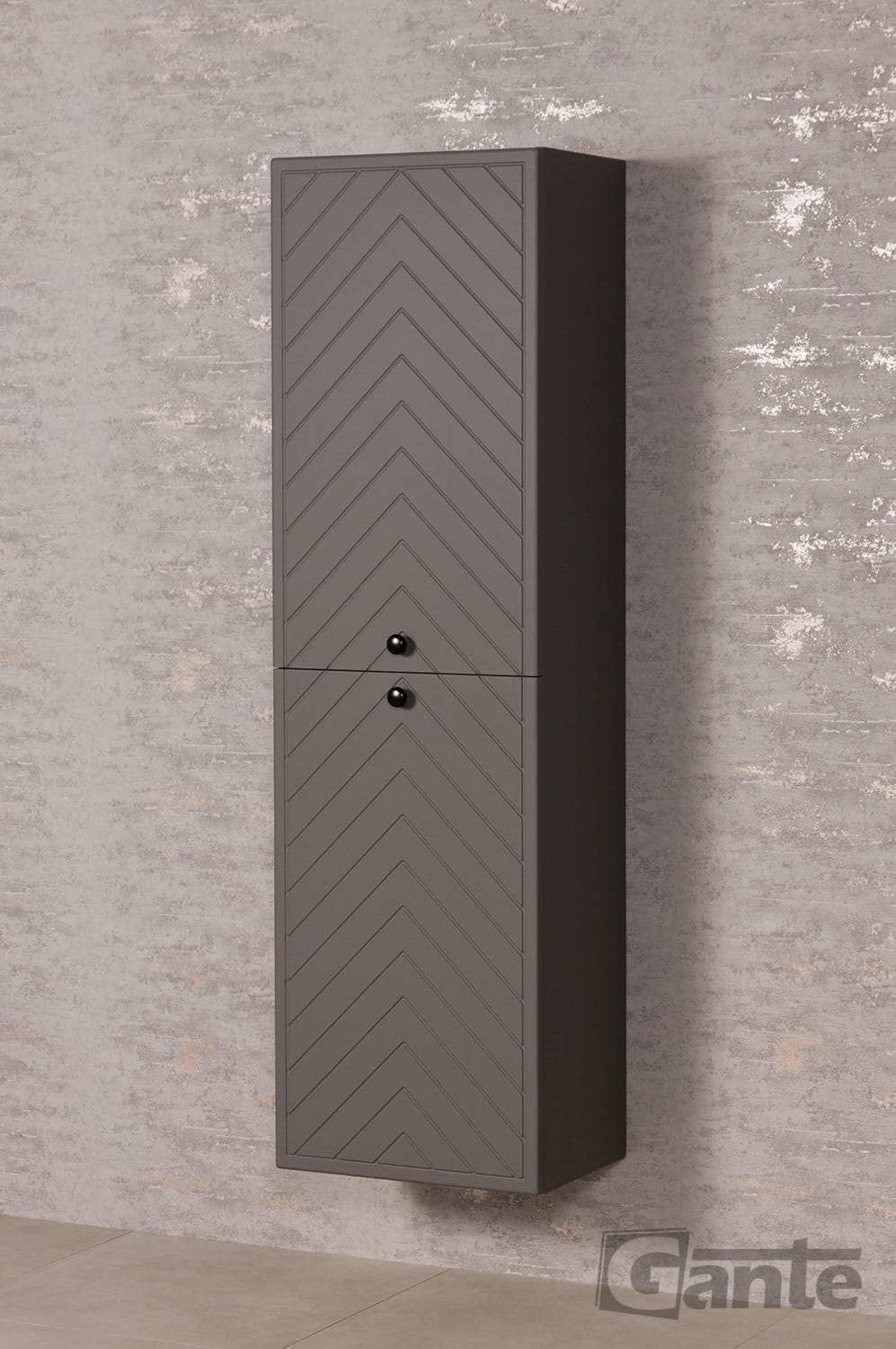 Regał łazienkowy wiszący z kolekcji Kodi w grafitowym, matowym kolorze. Fronty regału zostały ozdobione frezami we wzór jodełki. Słupek posiada dwoje drzwiczek, za którymi znajdziemy w sumie 6 półek o regulowanej wysokości. Do otwierania regału służą eleganckie uchwyty w postaci białych gałek meblowych. Drzwi regału wyposażone są w zawiasy z systemem cichego domykania, który sprawia, że drzwiczki w ostatniej fazie zamykania zwalniają, aby niemal bezgłośnie się zamknąć.