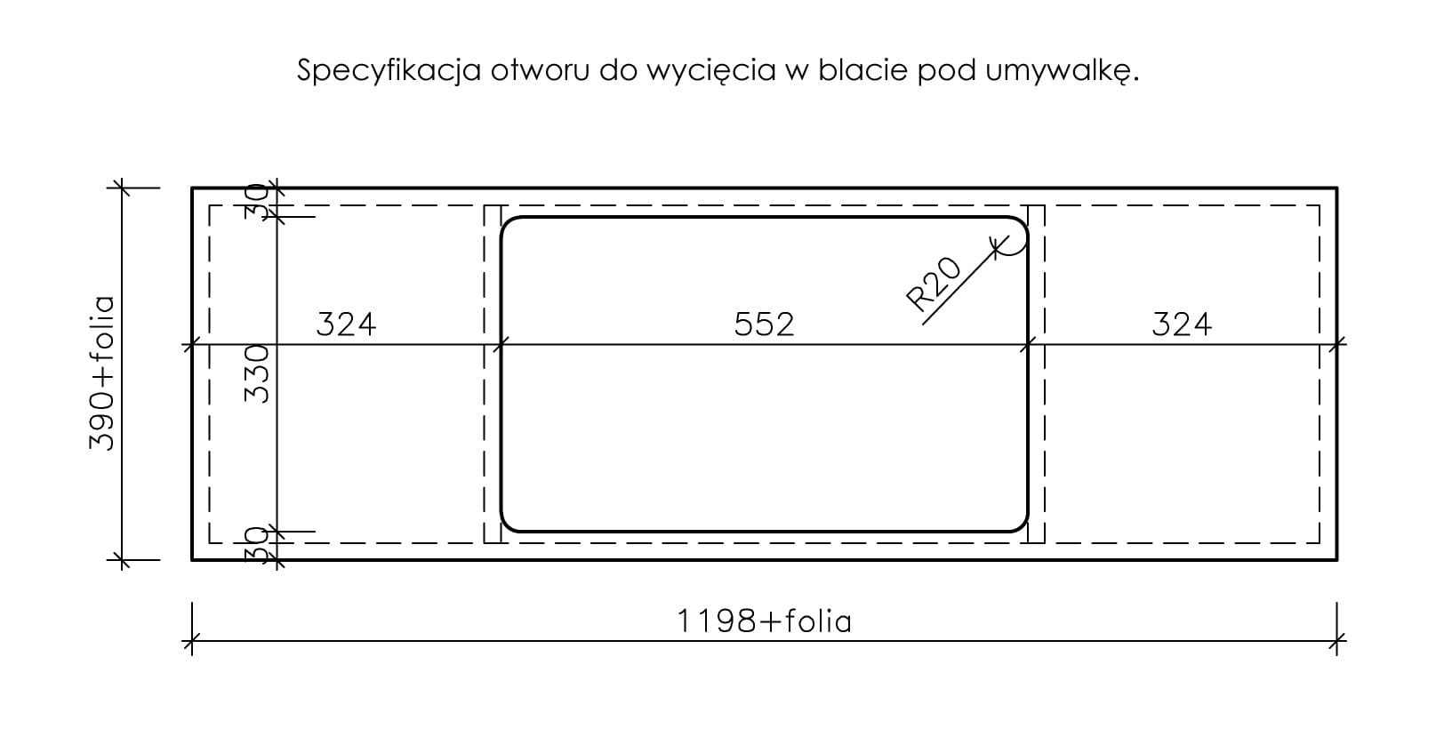 Aby umożliwić Klientom zastosowanie innej umywalki do naszej szafki, blaty łazienkowe sprzedawane są bez otworu na umywalkę. Jeśli masz już swoją umywalkę i chcesz ją zamontować na szafce z naszej oferty - wystarczy, że kupisz oferowany zestaw bez umywalki i przygotujesz w blacie otwór dostosowany do wybranej umywalki.