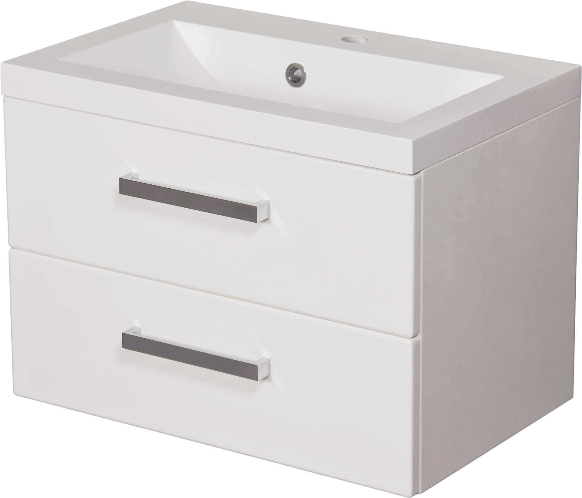 Szafka pod umywalkę FOKUS NEW w białym, połyskowym kolorze wraz z dolomitową umywalką. Szafka posiada dwie szuflady.