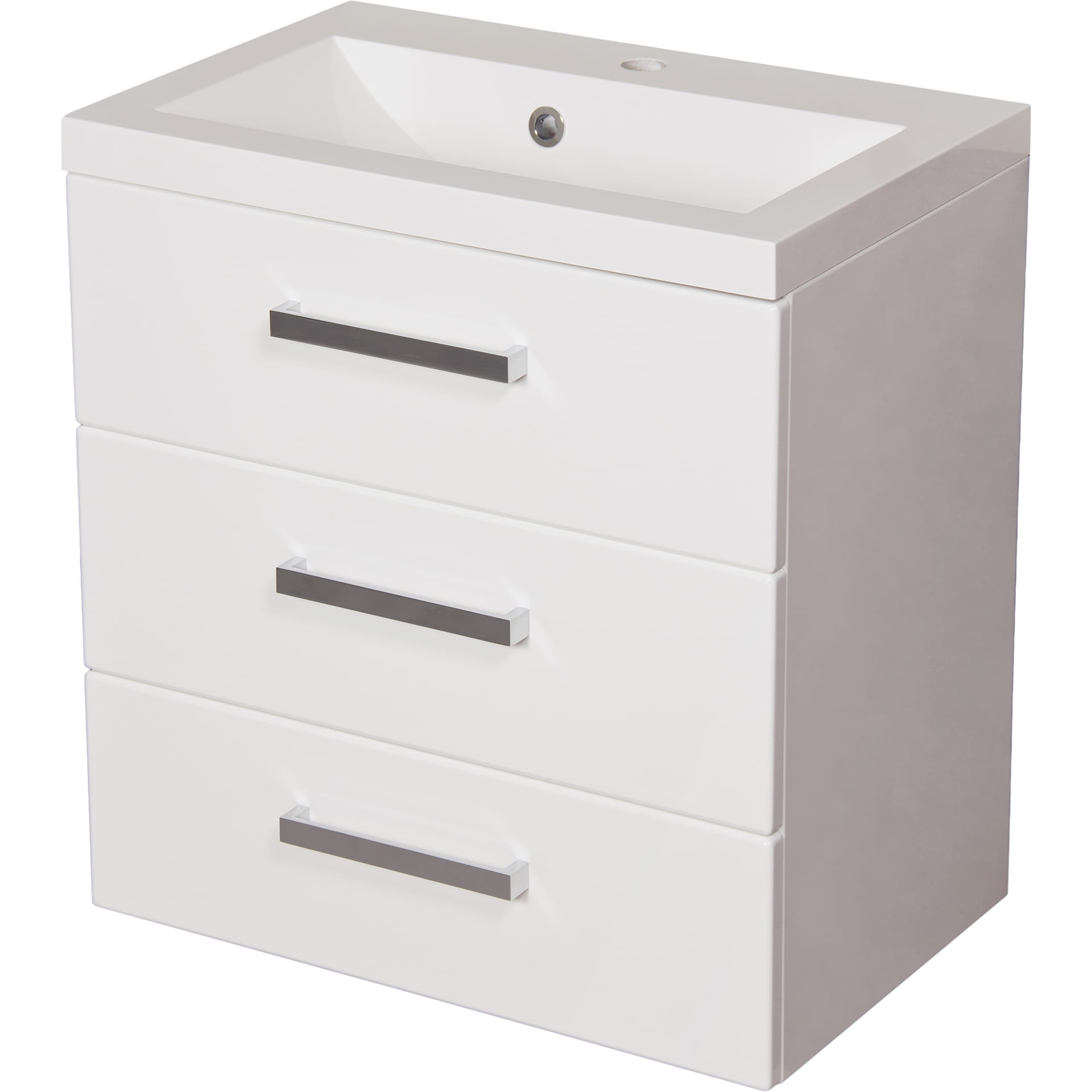Nowoczesna, bardzo ekskluzywna szafka łazienkowa w białym połyskowym kolorze wraz z białą, dolomitową umywalką z serii FOKUS NEW. Szafka posiada trzy szuflady. Umywalka posiada otwór na baterię.