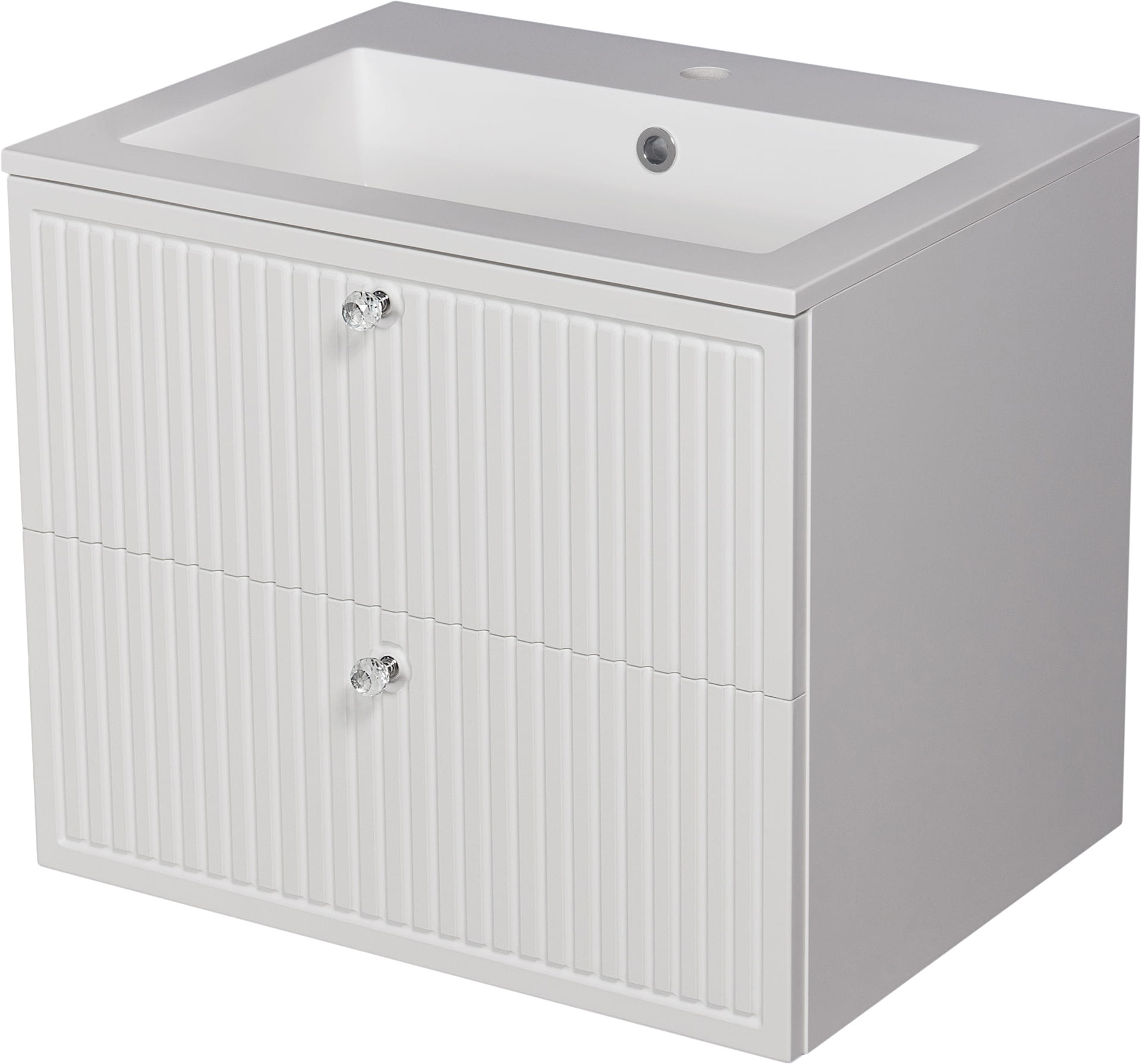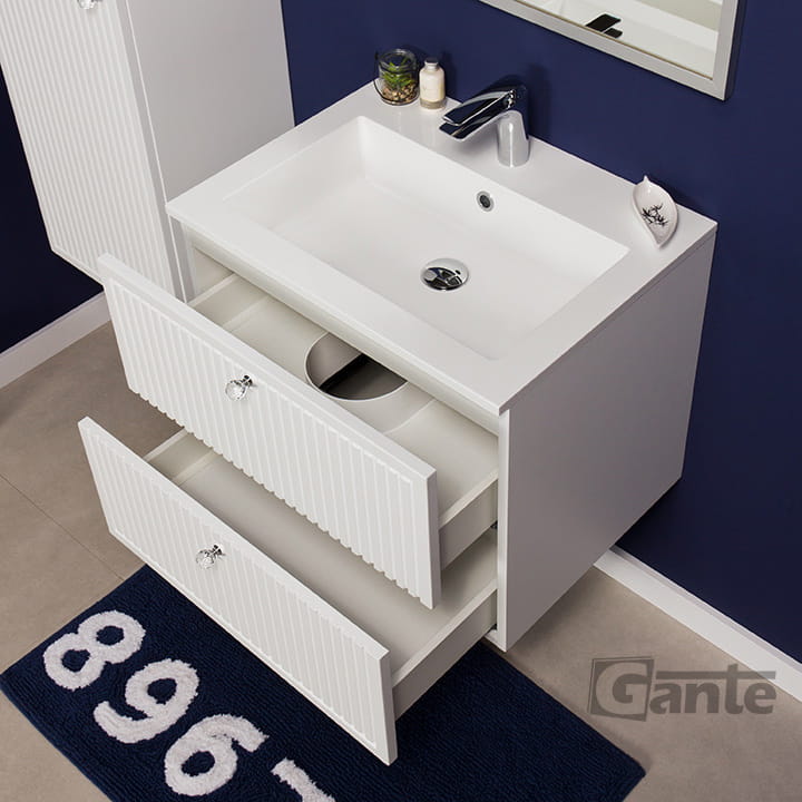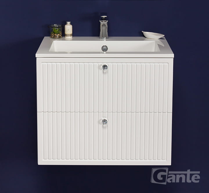 Szafka pod umywalkę o szerokości 61 cm z serii Argento w białym, matowym kolorze. Szafka posiada dwie szuflady, których fronty ozdobiono pionowymi frezami przypominającymi lamele czy meble ryflowane. Prowadnice wyposażono w system cichego domykania, który sprawia, że szuflady w ostatniej fazie zamykania zwalniają, aby niemal bezgłośnie się zamknąć. Do otwarcia szuflad posłuży nam elegancki uchwyt w postaci szklanej gałki meblowej.