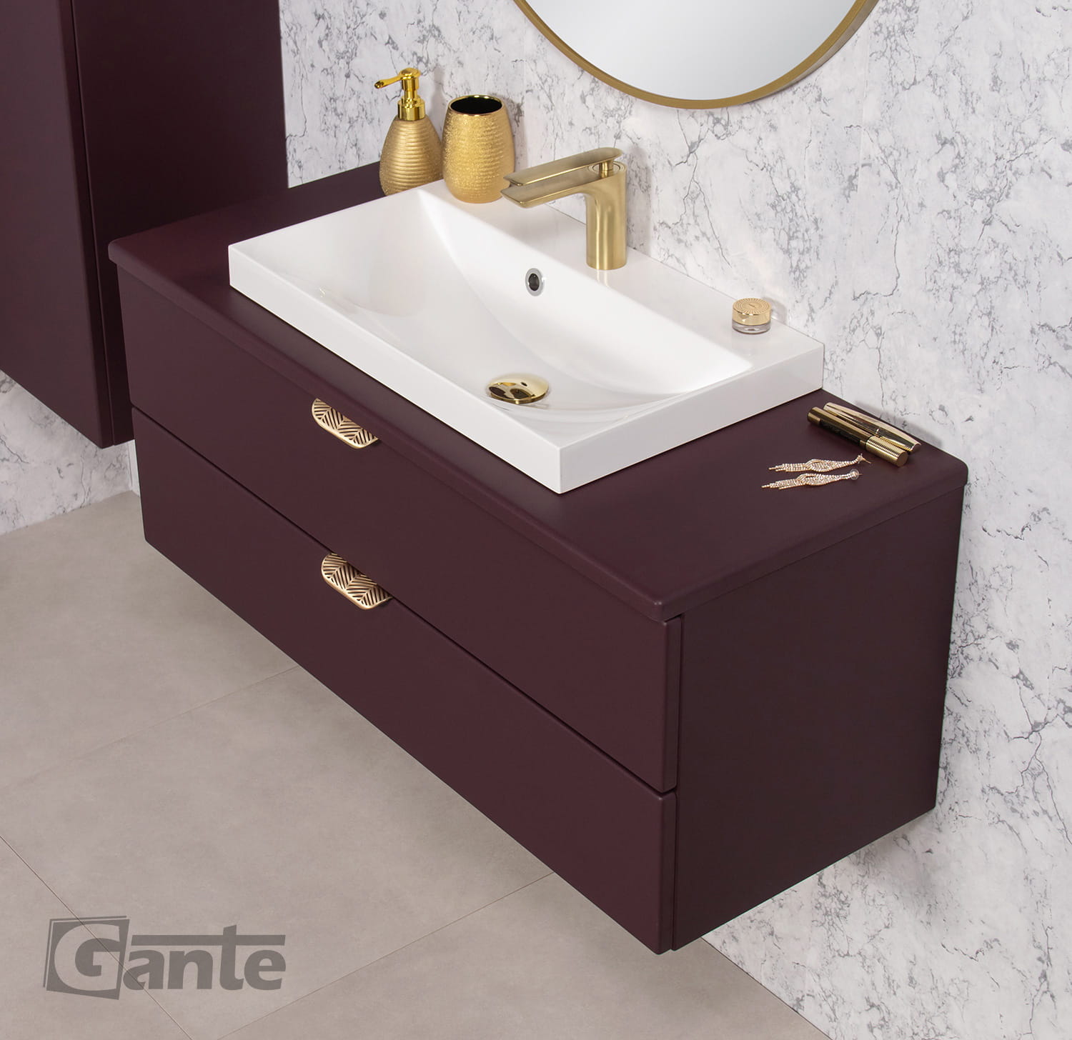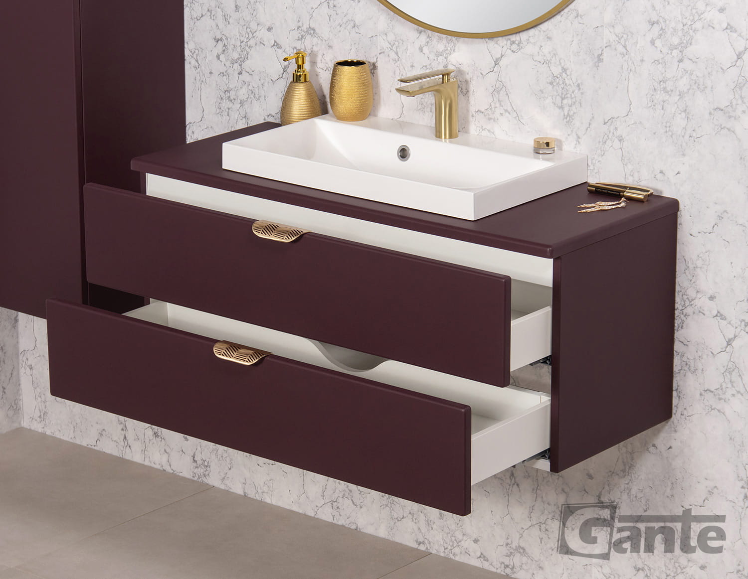 Szafka łazienkowa burgund 100 cm MAGNOLIA z blatem i umywalką - złote uchwyty