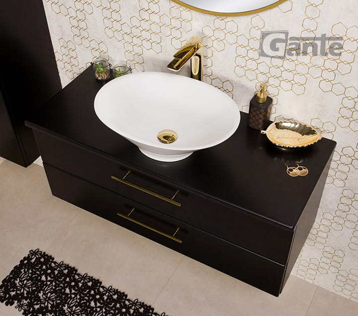Szafka łazienkowa w czarnym matowym kolorze i złotymi uchwytami wraz z blatem oraz prostokątną białą dolomitową umywalką z serii BELLI GOLD.