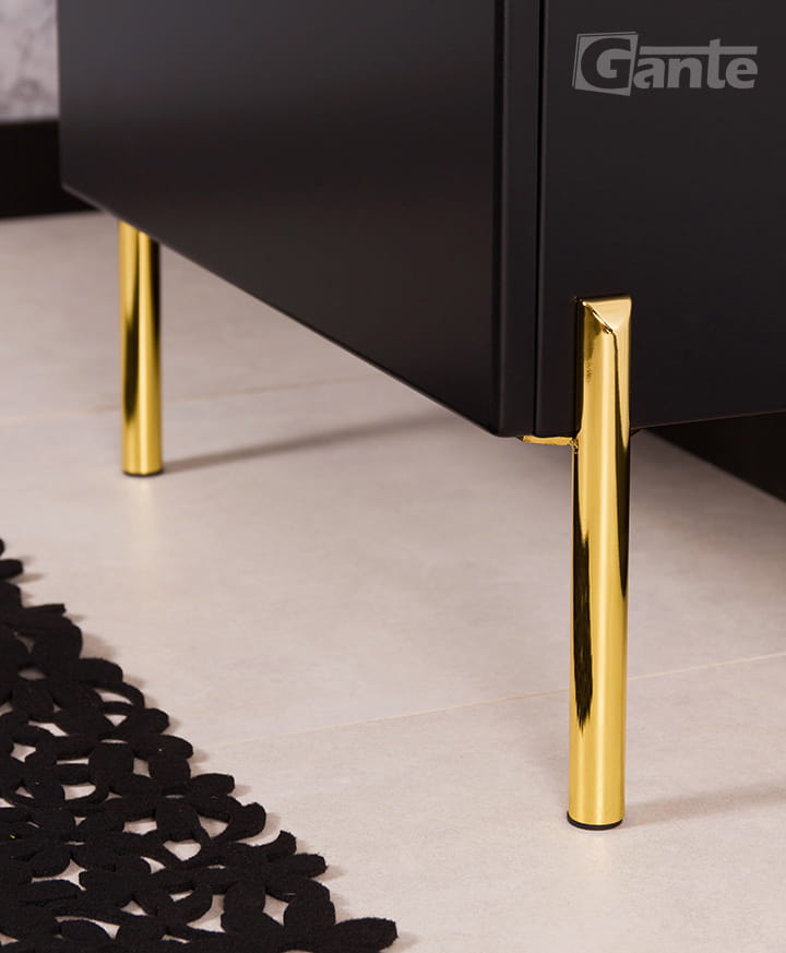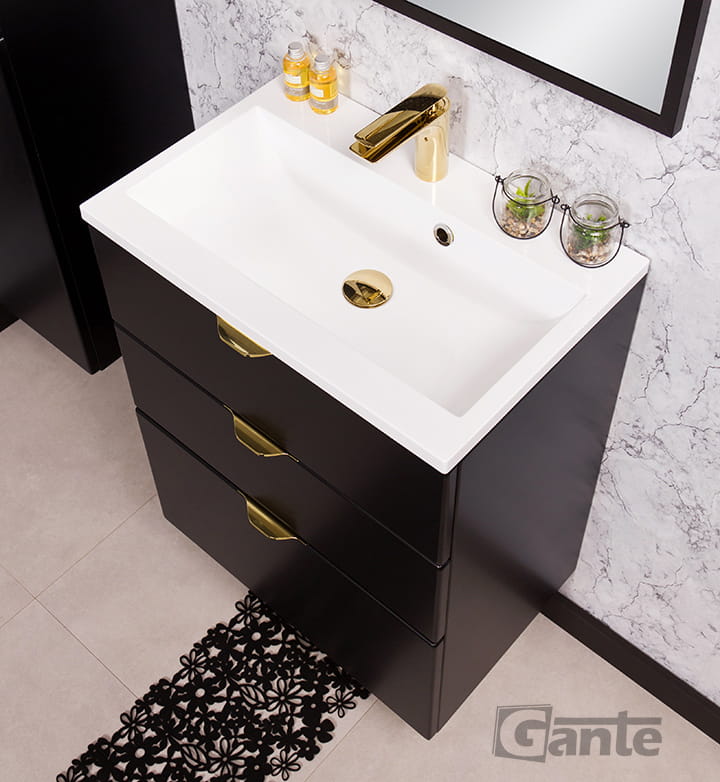 Kompromis między niewielkimi wymiarami a dużą pojemnością można w przypadku szafek łazienkowych osiągnąć dzięki zwiększeniu ich wysokości. Oto szafka do łazienki z serii Victa, która przy zaledwie 60 cm szerokości zapewnia niezrównaną pakowność. Trzy szuflady, w tym jedna wysoka, dają wystarczająco dużo miejsca, żeby schować w nich wszystkie akcesoria i przybory toaletowe. Czarne, matowe wykończenie i duża, biała umywalka dolomitowa zastępująca blat świetnie wyglądają, uzupełnione złotymi, subtelnymi, ale pięknymi uchwytami szuflad. Całość jest wykonana niezwykle precyzyjnie i jak zawsze wyłącznie z doskonałych materiałów, co przekłada się na ponadprzeciętną trwałość.