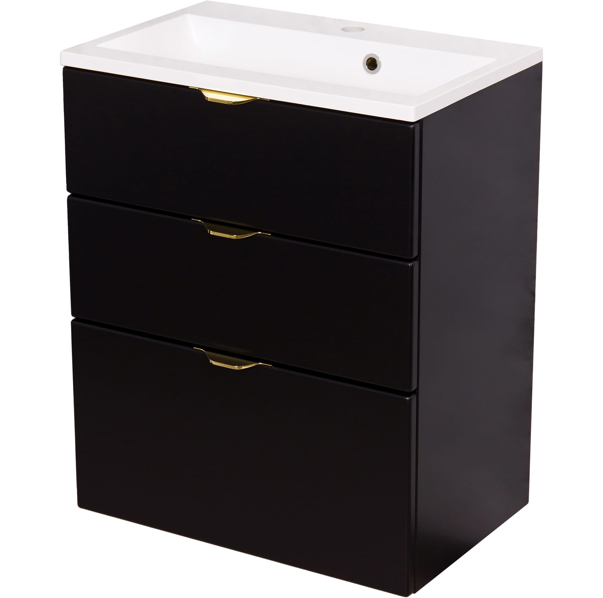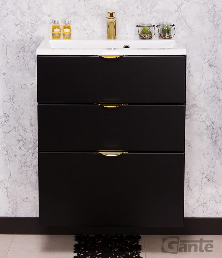 Szafka łazienkowa w czarnym matowym kolorze i złotymi uchwytami wraz z prostokątną białą dolomitową umywalką z serii VICTA. Szafka posiada trzy szuflady. Umywalka posiada otwór na baterię.