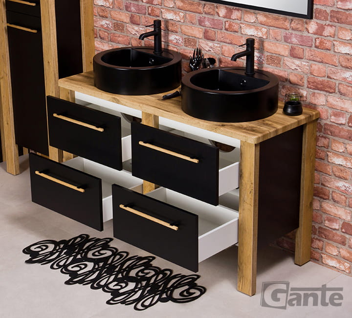 Stojąca szafka łazienkowa z serii Cortez w loftowym stylu wraz z blatem oraz dwiema czarnymi, dolomitowymi umywalkami. Korpus szafki jest w czarnym, matowym kolorze a blat i nogi w kolorze dębu naturalnego. Szafka posiada cztery szuflady.
