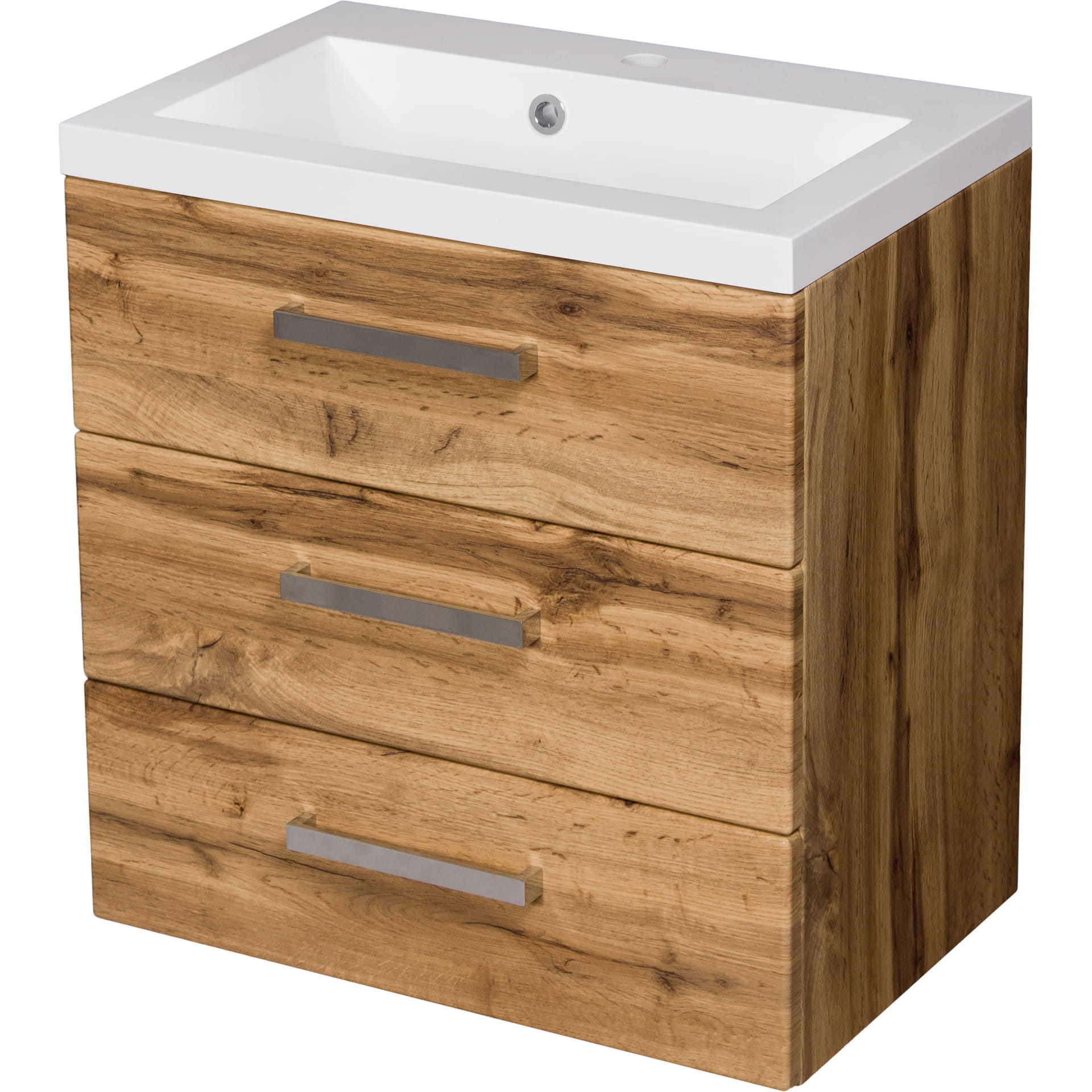 Nowoczesna, bardzo ekskluzywna szafka łazienkowa w kolorze natural eiche (dąb naturalny) wraz z białą, dolomitową umywalką z serii FOKUS. Szafka posiada trzy szuflady. Umywalka posiada otwór na baterię.
