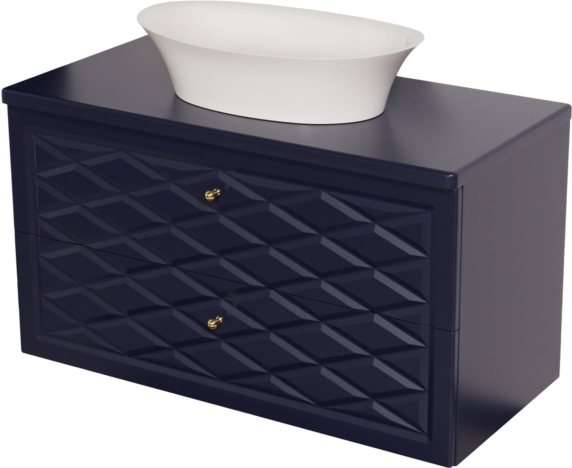 Nowoczesna, bardzo ekskluzywna szafka łazienkowa z serii Cobra w granatowym, matowym kolorze wraz z blatem oraz białą, dolomitową umywalką. Szafka posiada dwie szuflady.