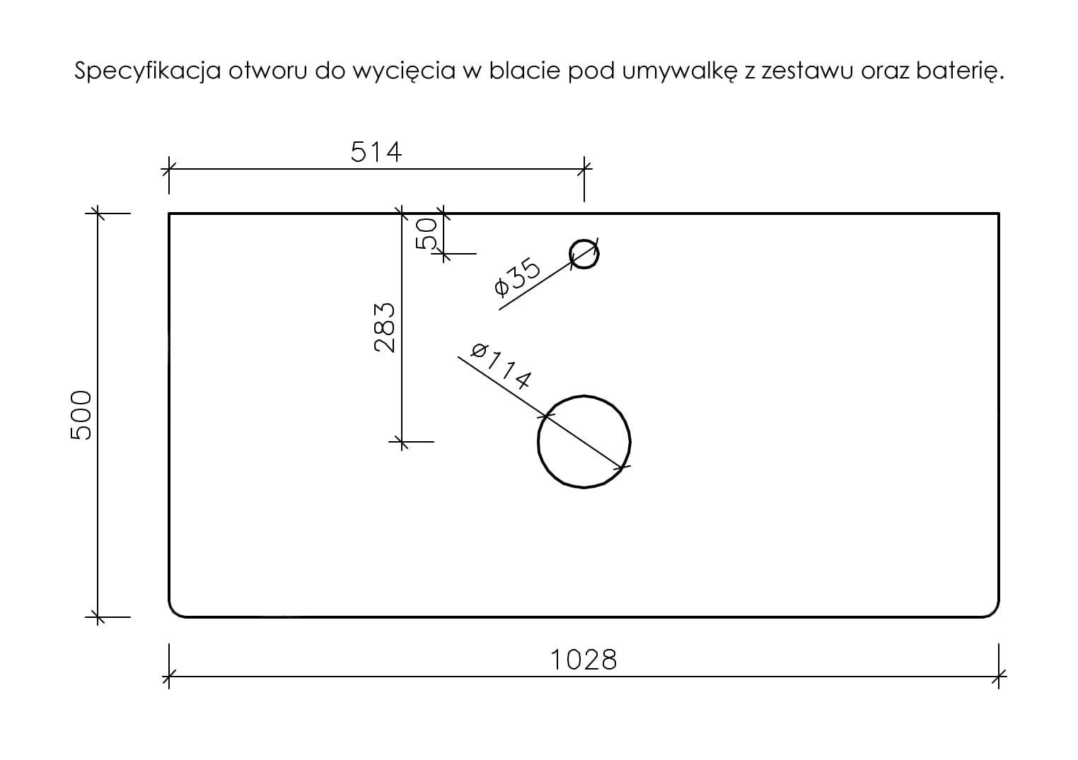 Aby umożliwić Klientom zastosowanie innej umywalki do naszej szafki, blaty łazienkowe sprzedawane są bez otworu na umywalkę. Jeśli masz już swoją umywalkę i chcesz ją zamontować na szafce z naszej oferty - wystarczy, że kupisz oferowany zestaw bez umywalki i przygotujesz w blacie otwór dostosowany do wybranej umywalki.