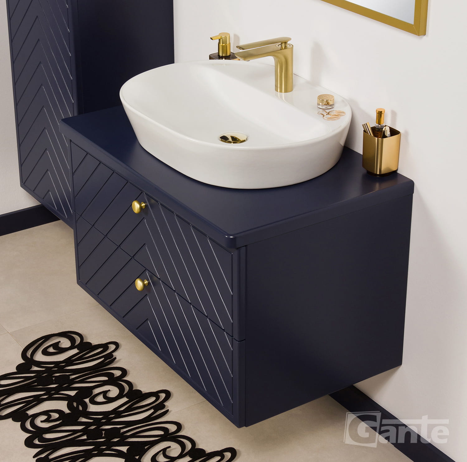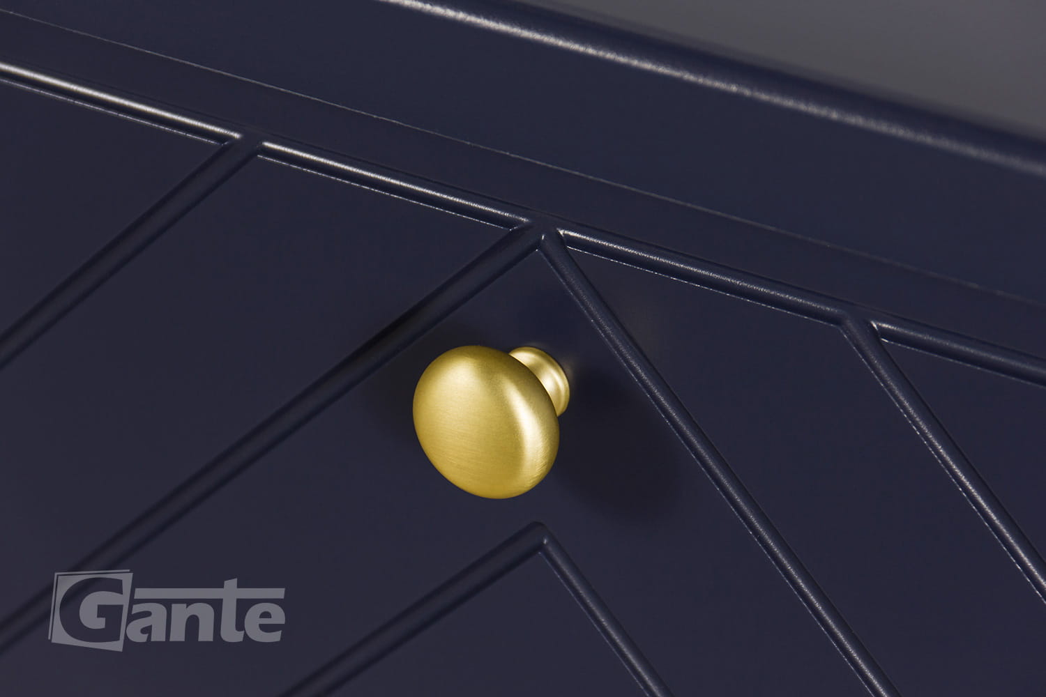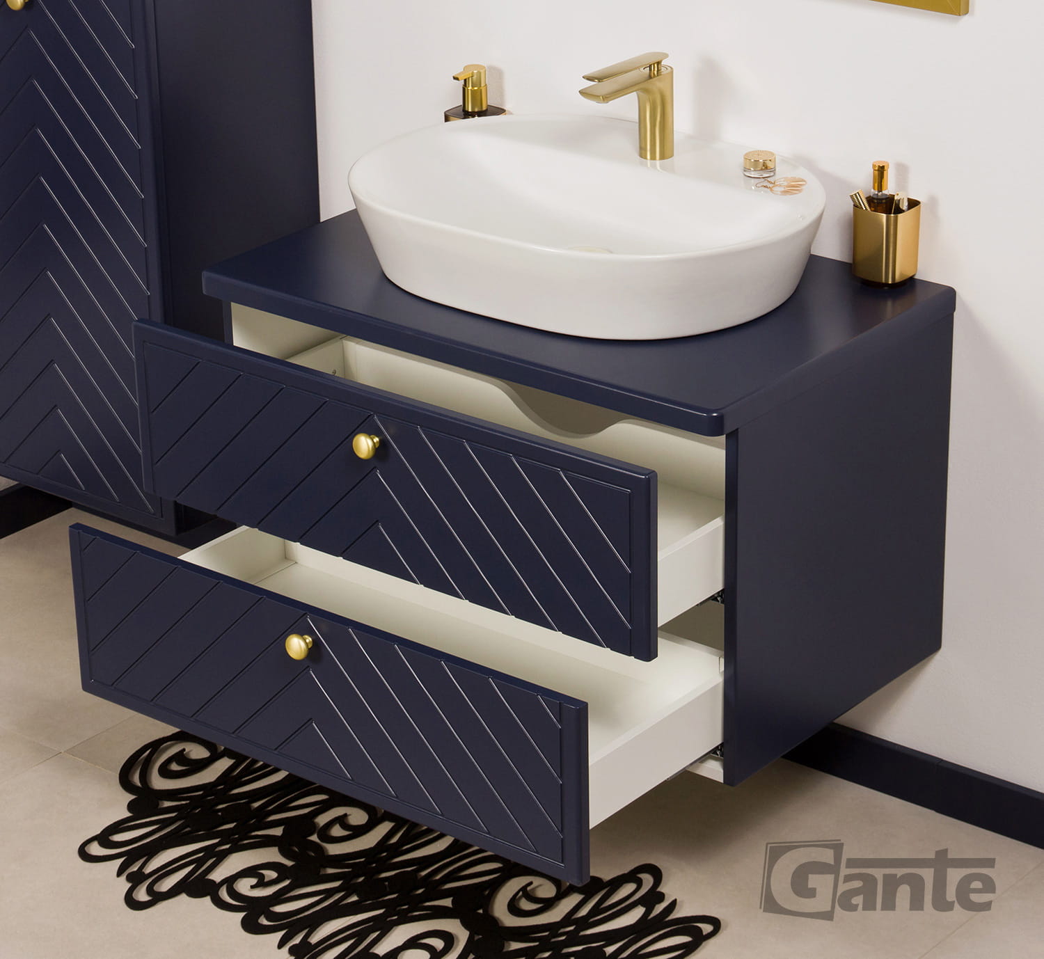 Szafka z umywalką ze wzorem jodełki o szerokości 80 cm w granatowym, matowym kolorze. Szafka posiada dwie szuflady zdobione frezami na kształt jodełki, które nadają wyjątkowy charakter samej szafce jak i całej łazience, w której się znajdzie. Jodełka to klasyka, która nigdy nie wyszła z mody. Drugim, klasycznym akcentem w tej szafce są uchwyty - owalne gałki w wykończeniu szczotkowanego złota. Prowadnice szuflad wyposażono w system cichego domykania, który sprawia, że w ostatniej fazie zamykania zwalniają, aby niemal bezgłośnie się zamknąć. Ponad szufladami znajdziemy solidne miejsce dla naszej umywalki - gruby na 3 cm, wyrazisty blat z przyjemnymi zaokrągleniami.