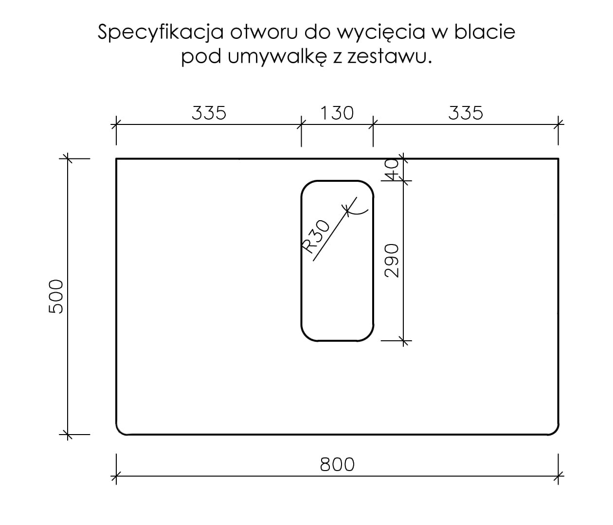 Aby umożliwić Klientom zastosowanie innej umywalki do naszej szafki, blaty łazienkowe sprzedawane są bez otworu na umywalkę. Jeśli masz już swoją umywalkę i chcesz ją zamontować na szafce z naszej oferty - wystarczy, że kupisz oferowany zestaw bez umywalki i przygotujesz w blacie otwór dostosowany do wybranej umywalki.