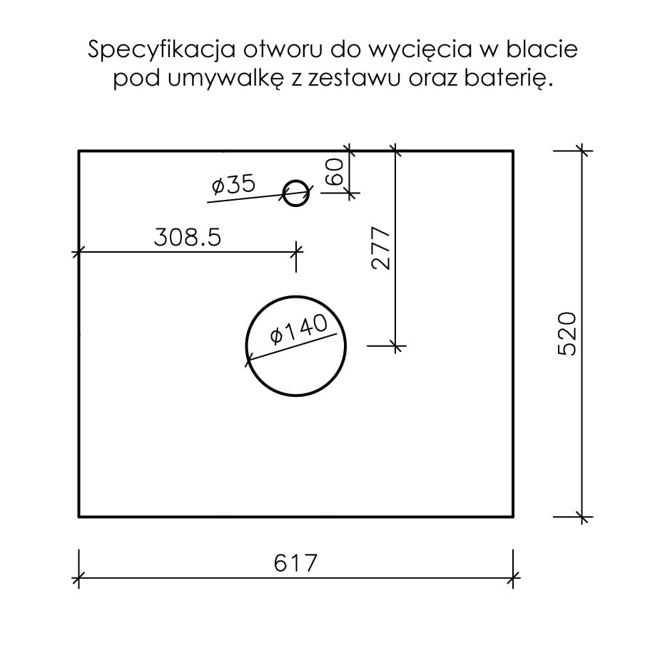 Aby umożliwić Klientom zastosowanie innej umywalki do naszej szafki, blaty łazienkowe sprzedawane są bez otworu na umywalkę. Jeśli masz już swoją umywalkę i chcesz ją zamontować na szafce z naszej oferty - wystarczy, że kupisz oferowany zestaw bez umywalki i przygotujesz w blacie otwór dostosowany do wybranej umywalki.