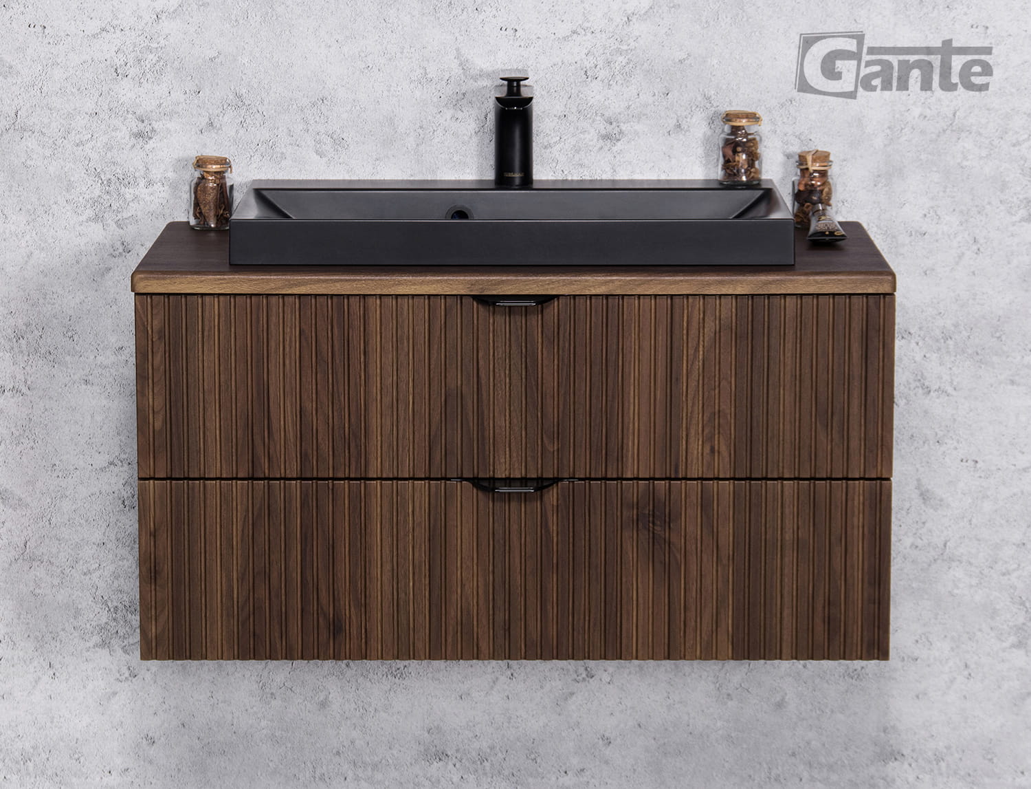 Szafka łazienkowa orzech 80 cm VICTA LAMELLO z blatem i umywalką czarną mat