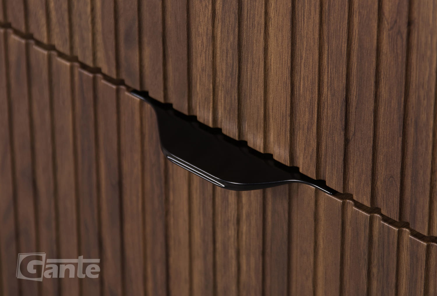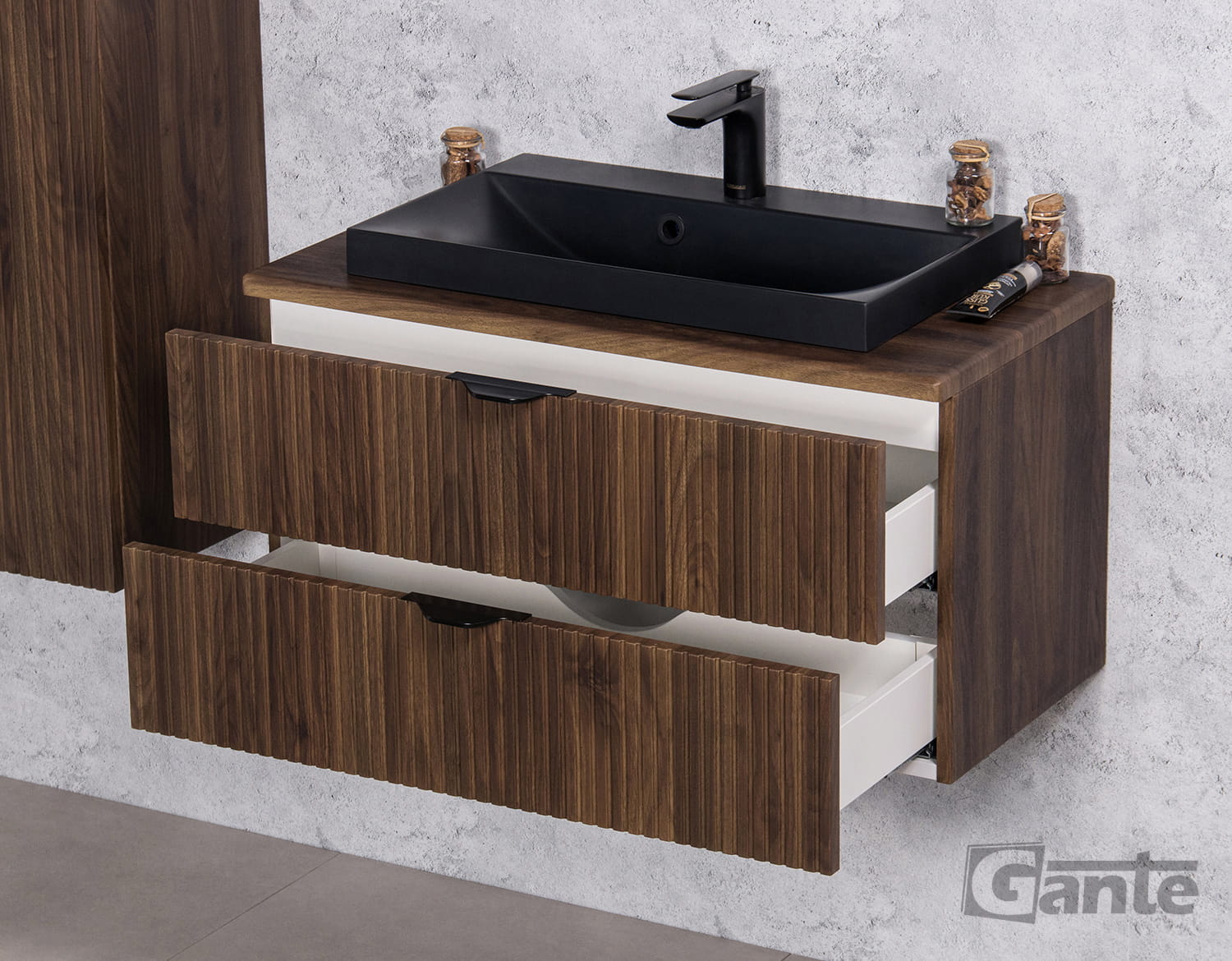 Szafka pod umywalkę 80 cm z lamelami w kolorze orzechu z serii Victa Lamello to propozycja, którą wyróżniają piękne fronty z frezami. Szafka posiada dwie szuflady wyposażone w prowadnice z systemem cichego domykania, który sprawia, że w ostatniej fazie zamykania zwalniają, aby niemal bezgłośnie się zamknąć. W górnej szufladzie znajdziemy wycięcie z kołnierzem na syfon, a dolna szuflada jest w całości do wykorzystania. Do otwarcia szuflad posłużą nam proste, delikatne uchwyty krawędziowe - standardowo w kolorze czarnym matowym, jednak w ofercie posiadamy również takie same uchwyty w kolorze białym, chromowanym oraz złotym. Na życzenie możemy zamienić czarne uchwyty na inne z wymienionych.