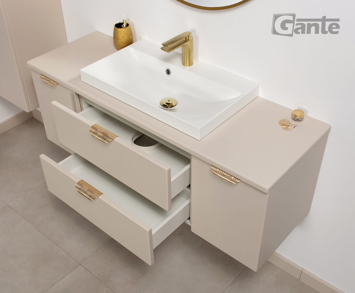 Szafka pod umywalkę z blatem 120 cm z serii Magnolia wykończona została matową folią meblową w kolorze piaskowym. Szafka posiada dwie pojemne szuflady oraz dwa większe schowki za drzwiczkami. Pozwoli to na upchanie bardzo wielu kosmetyków, ręczników czy innych drobiazgów. W górnej szufladzie, na środku znajduje się wycięcie na syfon, natomiast dolna szuflada jest w całości do dyspozycji użytkownika. Szafka w standardzie posiada prowadnice z systemem cichego domykania, dzięki którym szuflady w ostatniej fazie zamykania zwalniają, aby niemal bezgłośnie się zamknąć. Elementem charakterystycznym mebli do łazienki Magnolia są piękne, złote uchwyty krawędziowe ze wzorem jodełki, a dostępna jest również wersja z uchwytami czarnymi.