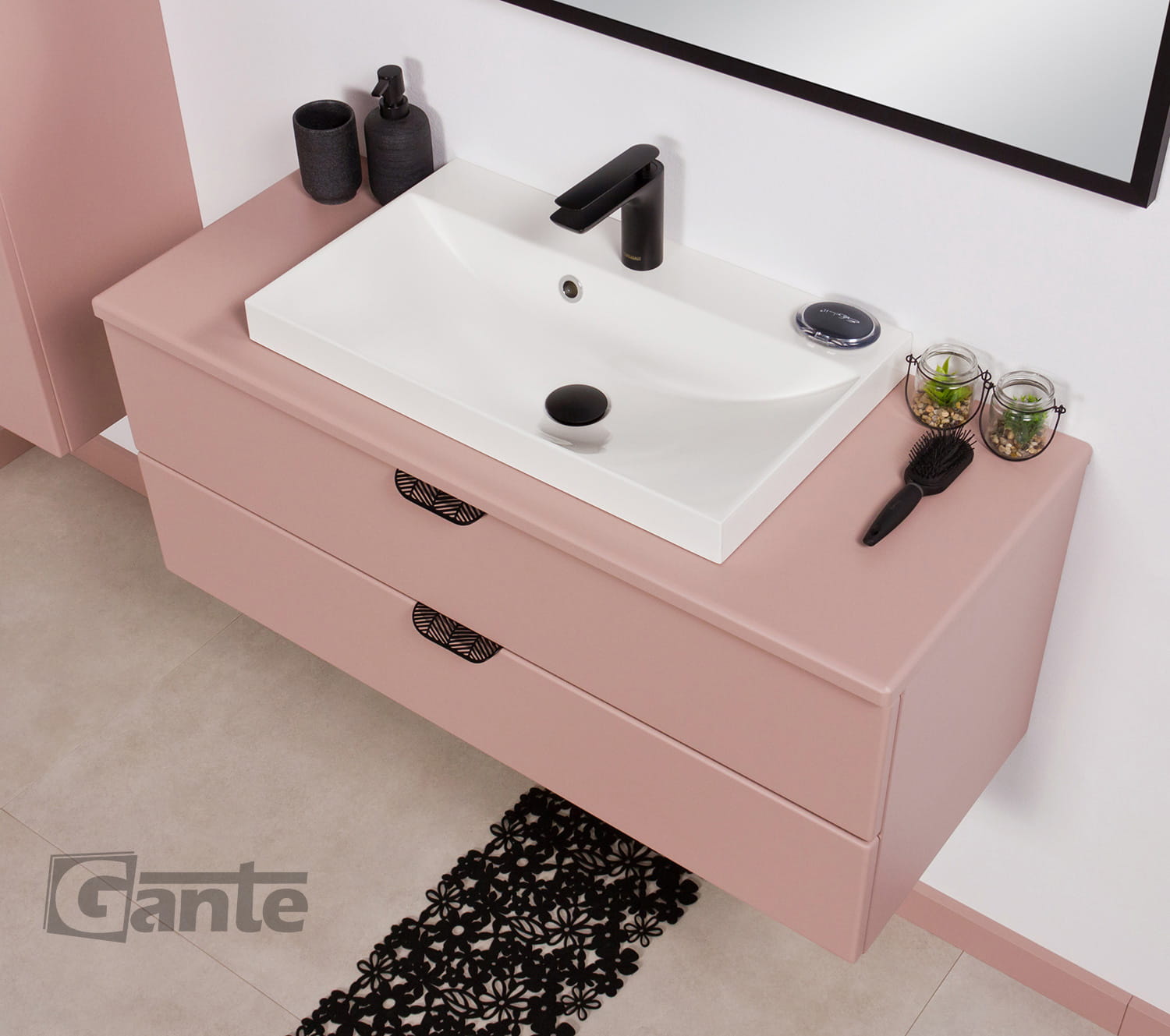 Szafka łazienkowa pudrowy róż 100 cm MAGNOLIA z blatem i umywalką - czarne uchwyty