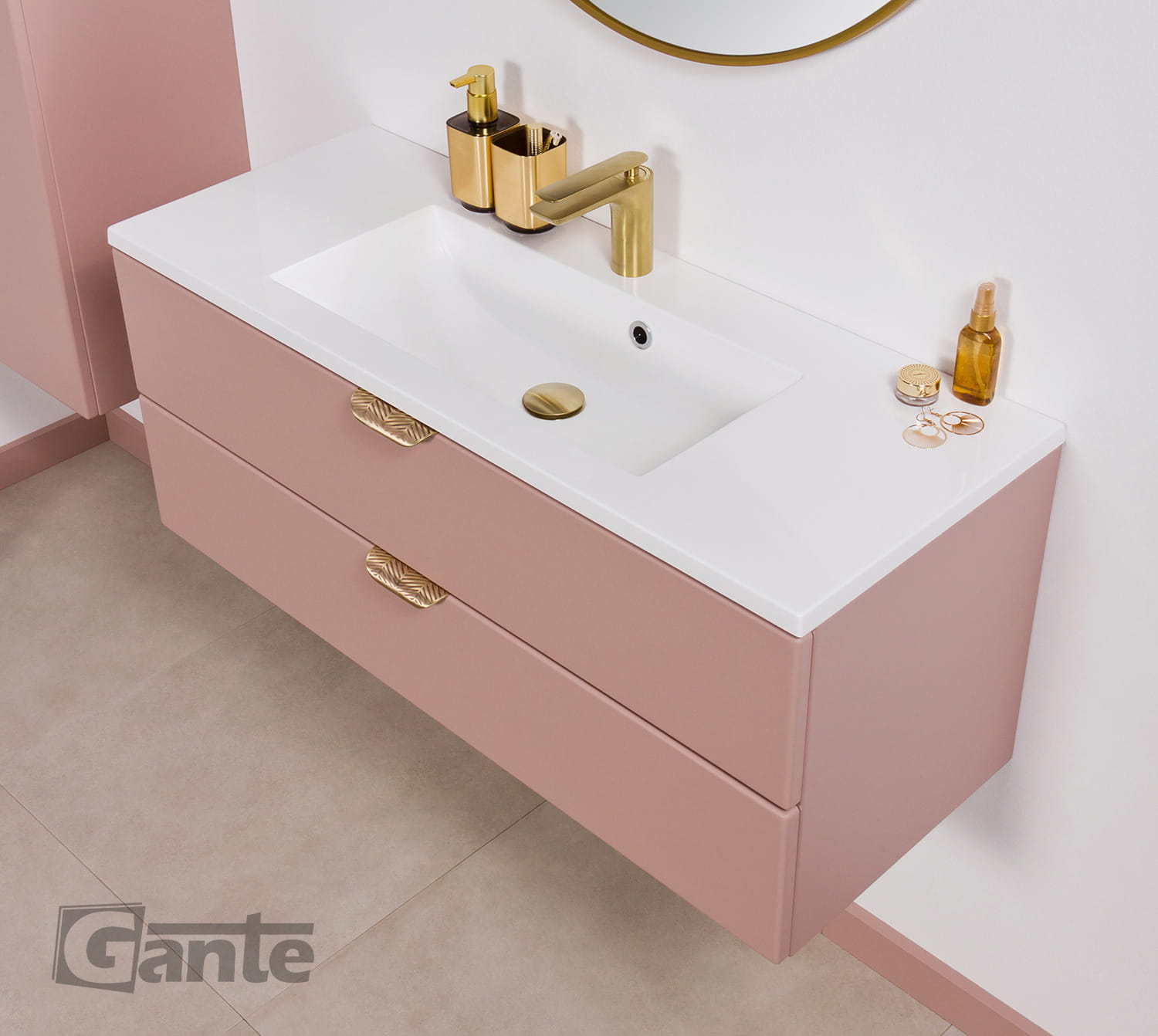 Szafka łazienkowa pudrowy róż 100 cm MAGNOLIA z umywalką - złote uchwyty