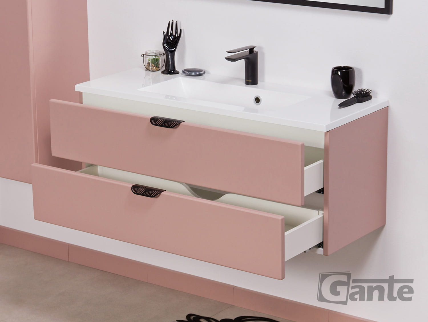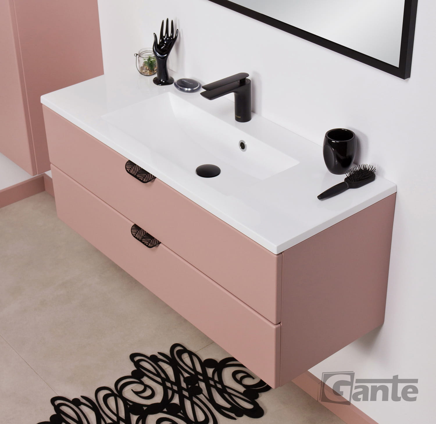 Szafka łazienkowa pudrowy róż 100 cm MAGNOLIA z umywalką - czarne uchwyty