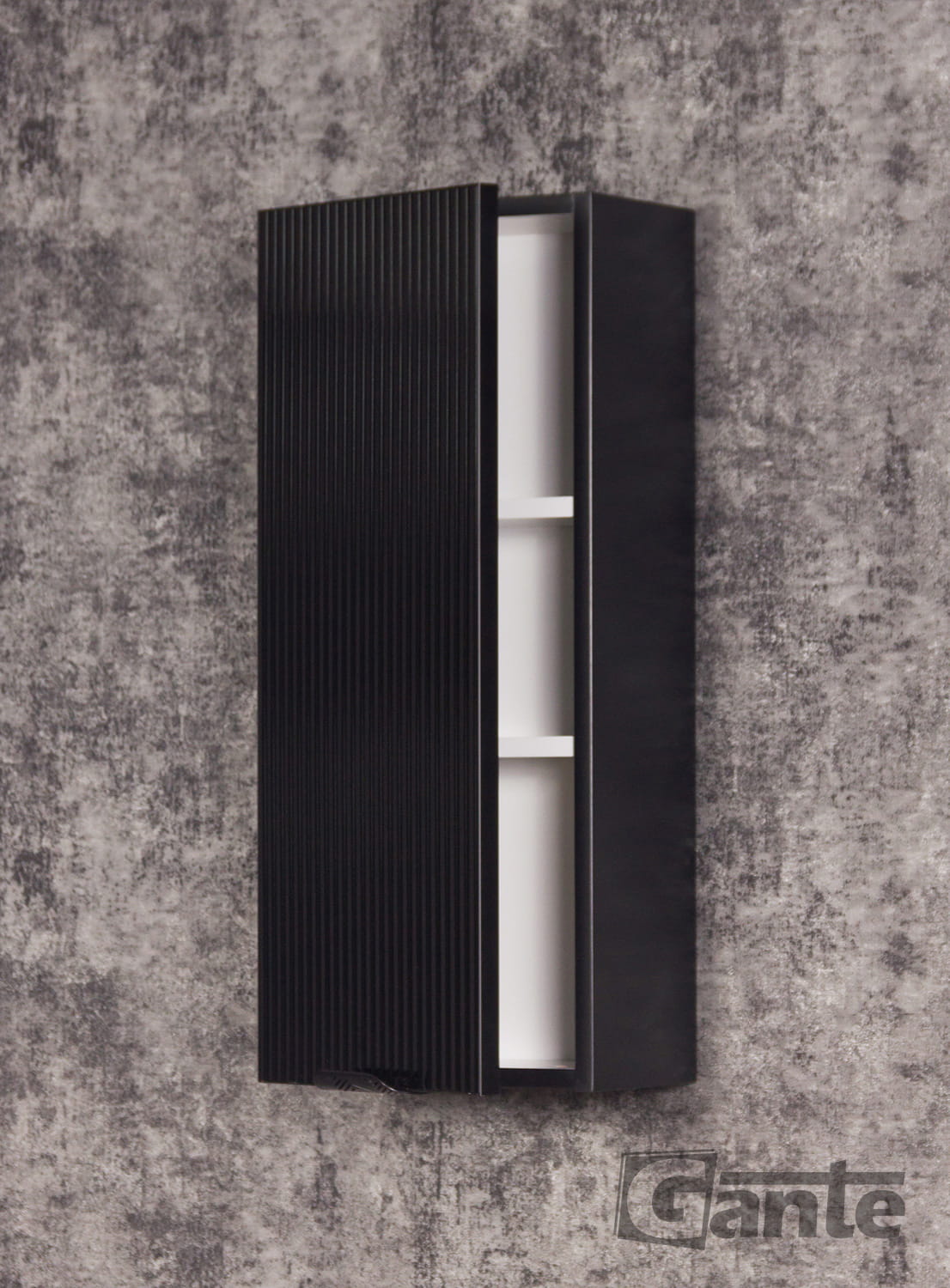 Wisząca, jednodrzwiowa szafka łazienkowa w czarnym kolorze z kolekcji Bravia to niewielka, bardzo zgrabna szafka o szerokości zaledwie 30 cm. Jednak dzięki trzem półkom wewnątrz o regulowanej wysokości, szafka pozwoli na schowanie wielu drobnych kosmetyków i przyborów łazienkowych. Front szafki wykonany został ze szkła hartowanego zdobionego pionowymi, symetrycznymi ryflami i wykończony eleganckim profilem aluminiowym w czarnym kolorze, dzięki któremu krawędź frontu nie ulegną uszkodzeniu. W szafce wiszącej zastosowano nowoczesne zawiasy które odpowiadają za ciche i płynne domykanie się drzwiczek. Do otwierania drzwiczek służy czarny uchwyt krawędziowy, który montujemy w standardzie, jednak w ofercie posiadamy również takie same uchwyty w kolorze złotym. Na życzenie Klienta możemy zamienić czarne uchwyty na złote.