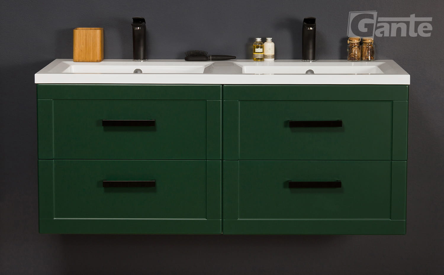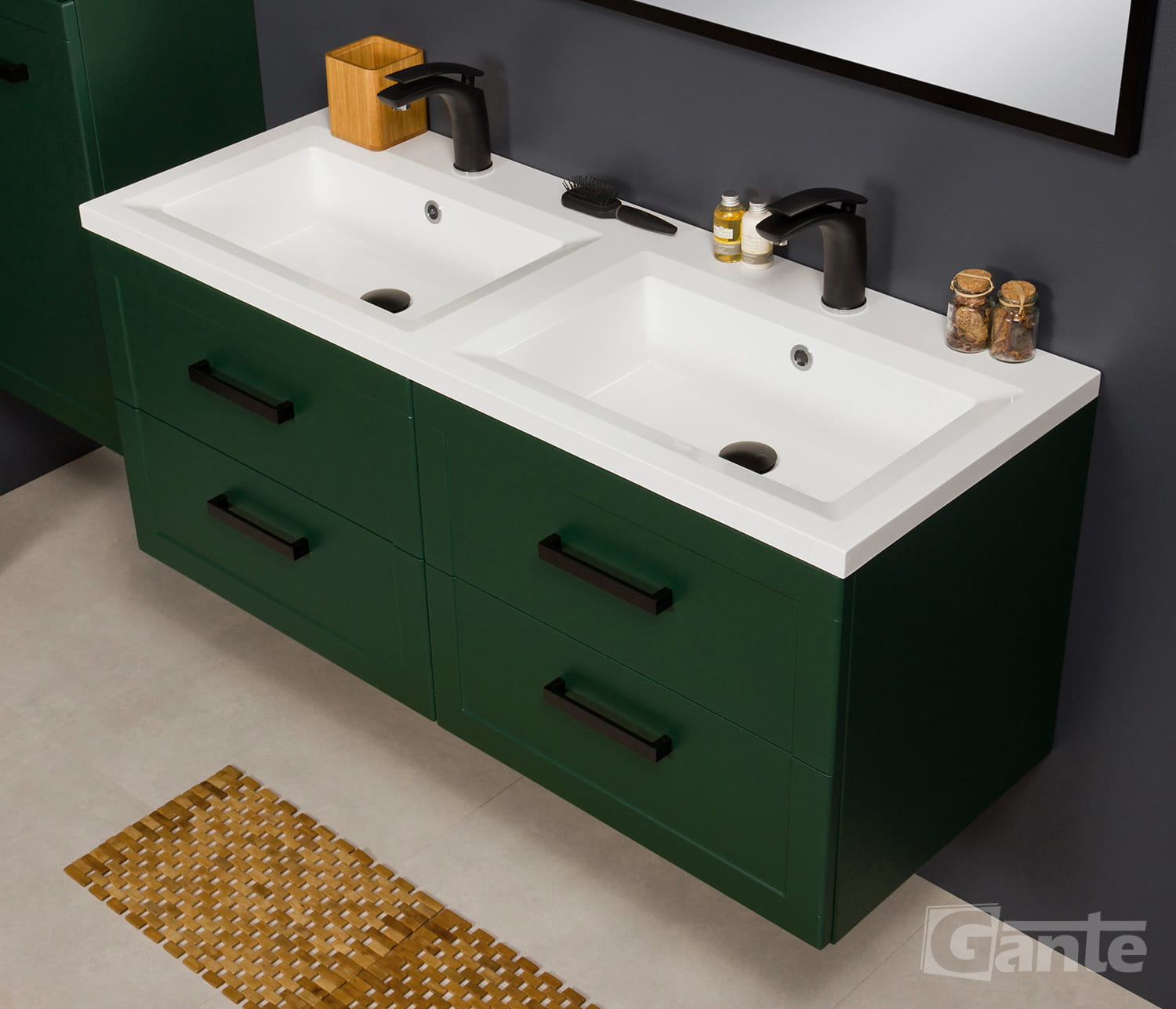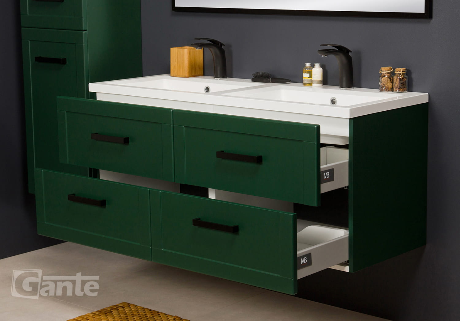 Ekskluzywna szafka łazienkowa w klasycznym stylu w zielonym, matowym kolorze wraz z podwójną, dolomitową umywalką z serii MEIVA. Szafka posiada cztery szuflady. Umywalka posiada otwory na baterie. Szafka wyposażona jest w system cichego domykania, który sprawia, że drzwiczki w ostatniej fazie zamykania zwalniają, aby niemal bezgłośnie się zamknąć.